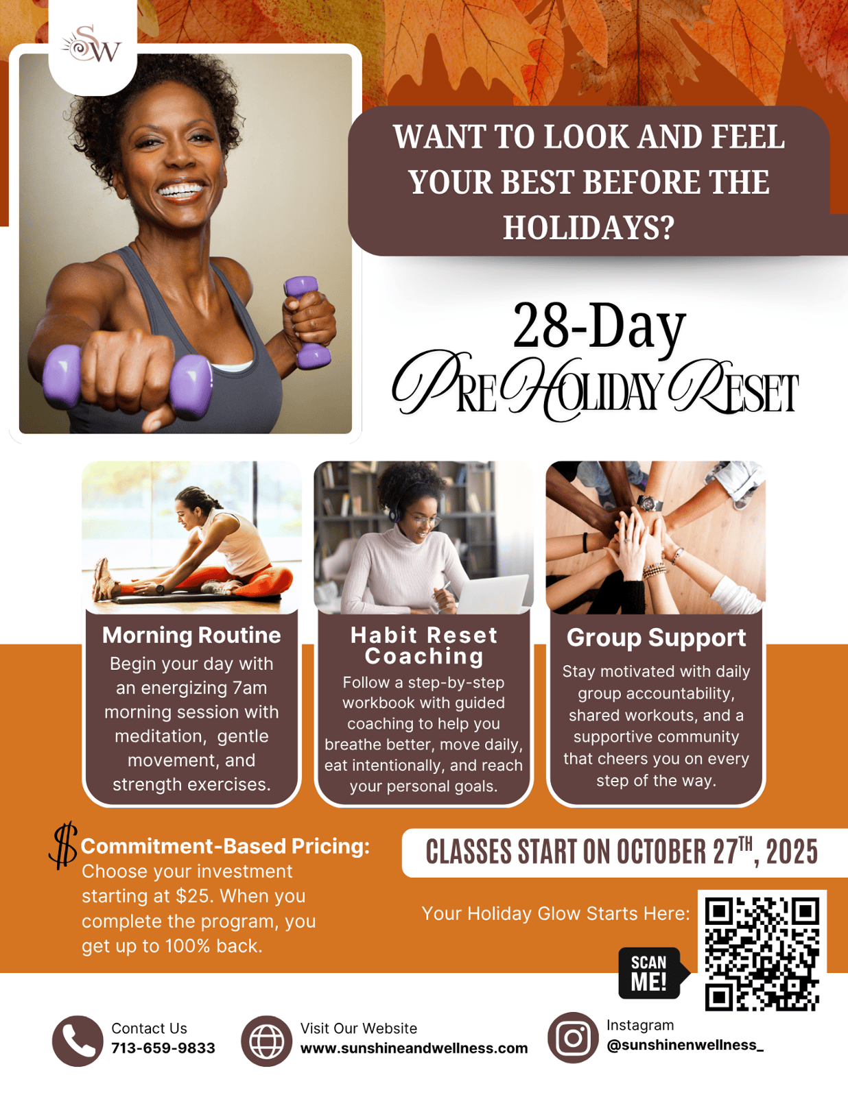 Join our 28-Day Challenge to reset your mind, body, and routines before the holidays. Through daily 7 AM Zoom sessions, guided coaching, and group support, you’ll build habits that leave you feeling energized, focused, and ready for the season!✨